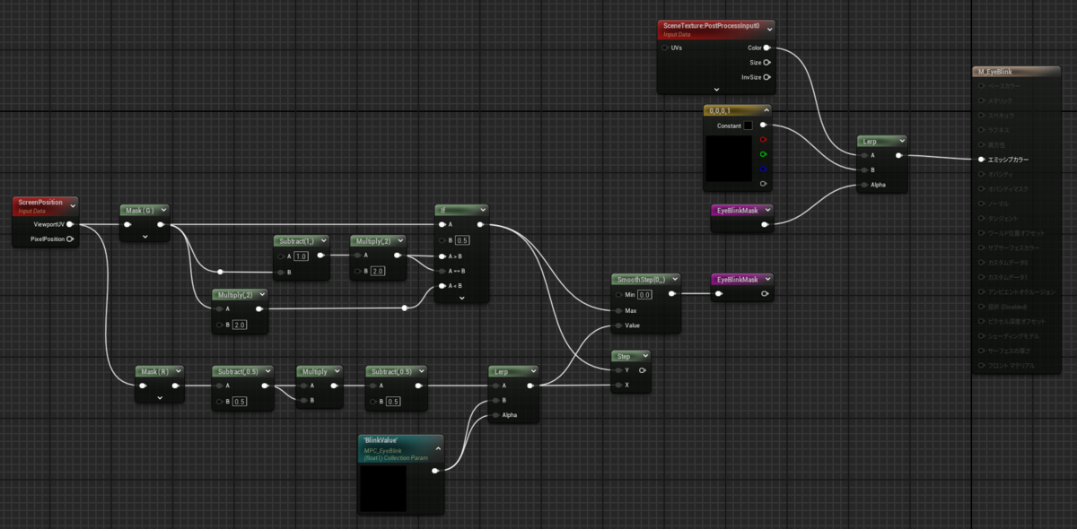 PostProcessInput0に対して、作成したマスクを使って黒色(瞼に覆われている部分の色)で補間します。
