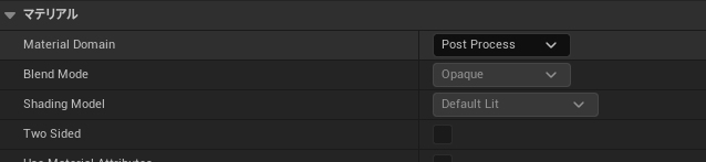ポストプロセスとして使うので、作成したマテリアルの編集画面にて、下図のようにマテリアルを設定します。
